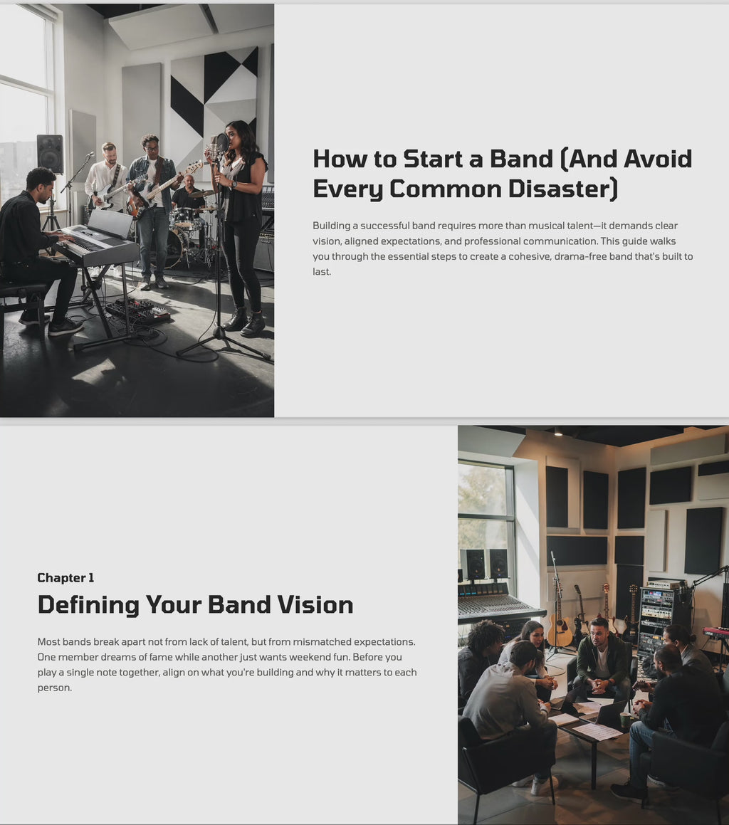 This comprehensive 10-chapter lesson pack walks musicians through every step of building a real, functioning band—from the very first idea to your first gig—while helping you avoid the mistakes that break most bands before they even start.